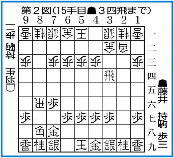 第1、3局で敗れた懸案の後手番を迎え、用意していた作戦は、やはり横歩取りだった。正確に表現すると相手の飛車に横歩を取るよう促す立ち上がりだ。本譜では15手目の▲3四飛(第2図)。