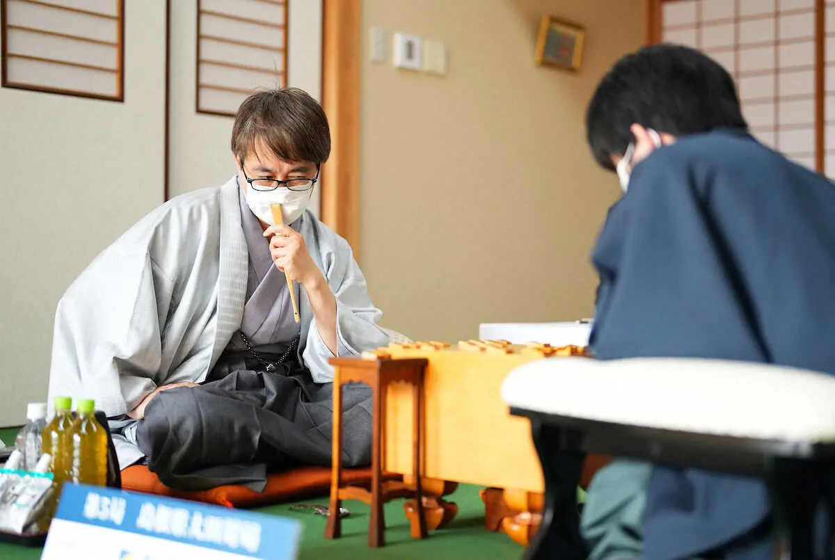 ) 午後6時。手番の羽生は封じ手を促されてもその意思を示さず、左側の脇息(きょうそく)を引き寄せて熟考モードを継続した。左手で髪をかき上げ、厳しい視線を盤面に投げかける。重い7分が経過して、ようやく口を開き「封じます」と宣言。「かなり攻められている形。こちらがどれぐらいしのげるか、という局面だと思います」と激動の第1日を締めくくった。