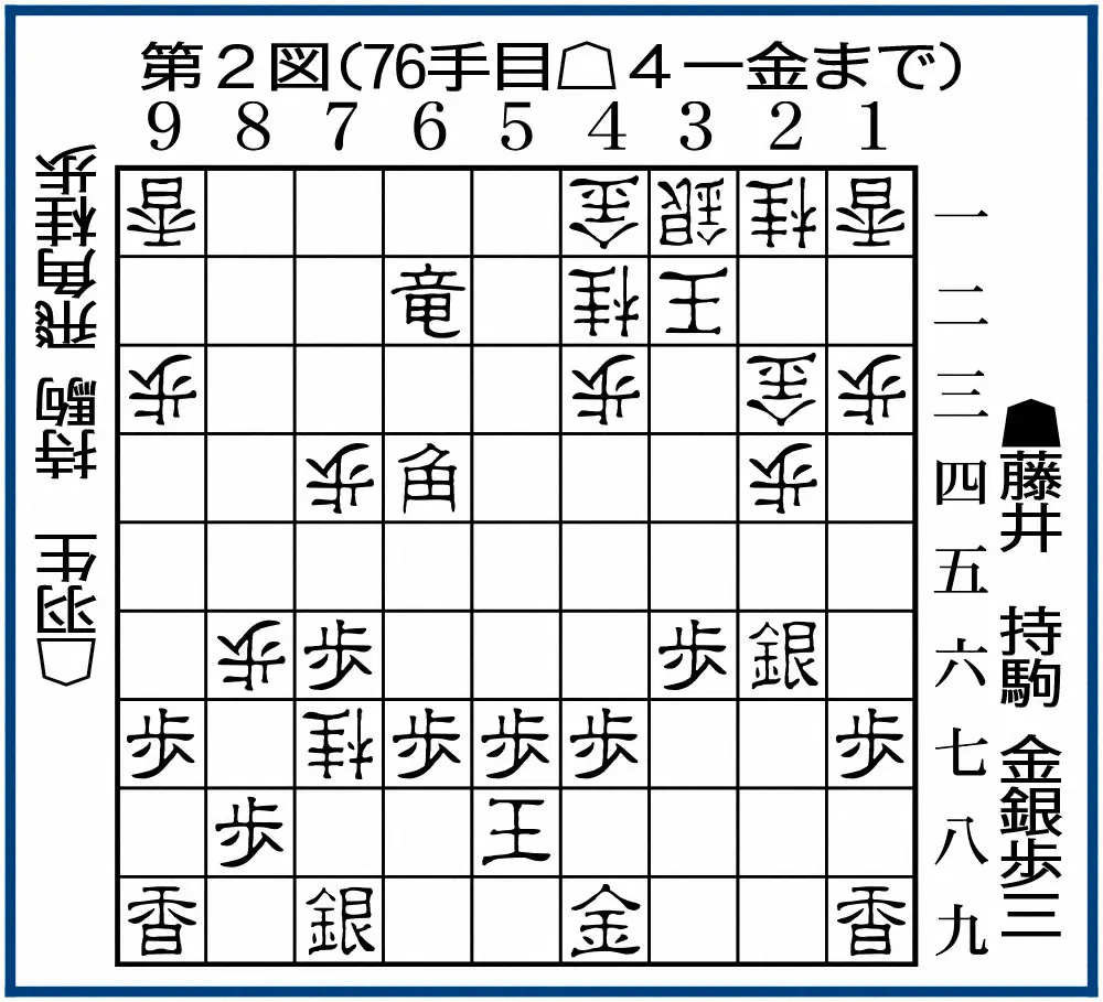 追い込まれた英雄が突如として牙をむいた。完敗ムードが漂いつつある終盤戦。羽生王の右サイドから角竜の大駒2枚に攻められ、絶体絶命的状況となった76手目に打った△4一金(第2図)が妖しいオーラを周囲に放っている。