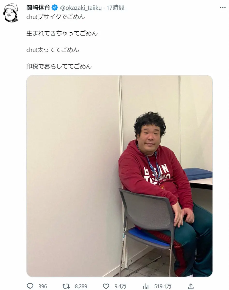 岡崎は、動画投稿アプリ「TikTok(ティックトック)」で流行中の楽曲「可愛くてごめん」の歌詞になぞらえ「chu!ブサイクでごめん 生まれてきちゃってごめん chu!太っててごめん 印税で暮らしててごめん」と投稿。自虐的なツイートが反響を呼び、約10万件の「いいね」を獲得した。