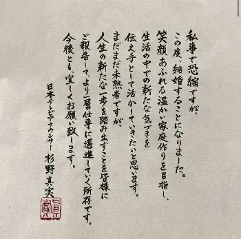 日テレ杉野真実アナ 2歳年下の会社員と“ネットフリックス婚”達筆な直筆文章で報告