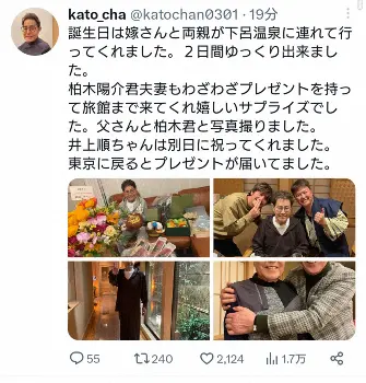 加藤は「誕生日は嫁さんと両親が下呂温泉に連れて行ってくれました。2日間ゆっくり出来ました」と報告。さらに「柏木陽介君夫妻もわざわざプレゼントを持って旅館まで来てくれ嬉しいサプライズでした」とし、栄護さんは加藤より年下だが、「父さんと柏木君と写真撮りました」とつづり、サッカーのFC岐阜の柏木、綾菜の父・栄護さんと撮った写真を投稿。また、仲の良いコメディアンの井上順(76)からも別の日に祝われたことも報告。自宅に届いた沢山のプレゼントも披露した。