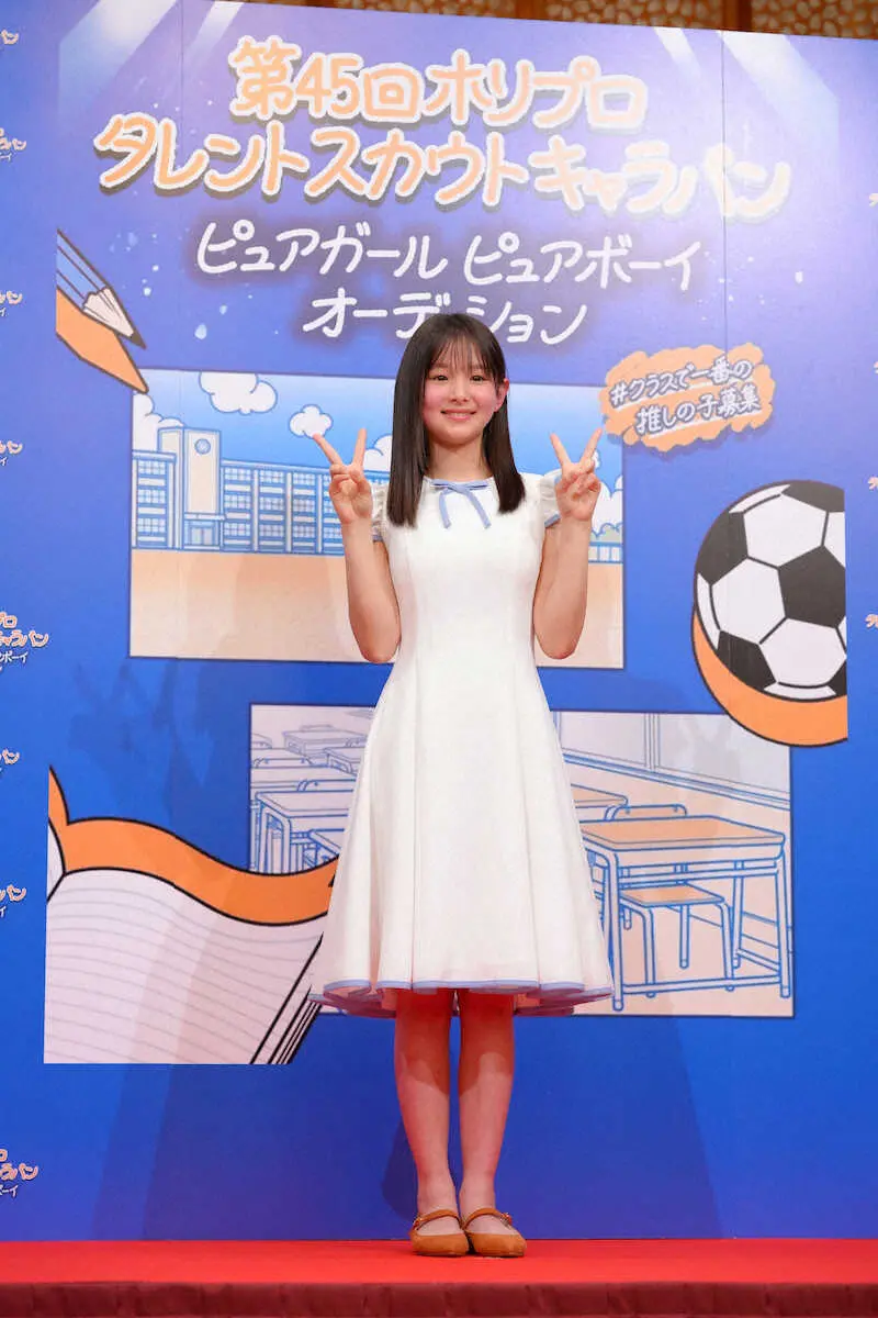深田恭子(40)石原さとみ(36)らを輩出した大手芸能事務所「ホリプロ」のオーディション「第45回ホリプロタレントスカウトキャラバン」のグランプリが5日、都内で発表された。選ばれたのは神奈川県出身の小田愛結(あゆ、11)で、史上最年少で栄冠に輝いた。選考は完全非公開で行われ、報道陣の前に登場するのは初めて。緊張した面持ちで「この日を迎えられてうれしい」と笑顔を見せた。
