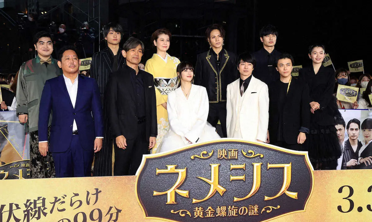 <映画「ネメシス」ジャパンとプレミア>フォトセッションを行う(前列左から)入江悠監督、江口洋介、広瀬すず、櫻井翔、勝地涼(後列左から)加藤諒、奥平大兼、南野陽子、上田竜也、中村蒼、富田望生(撮影・久冨木 修)