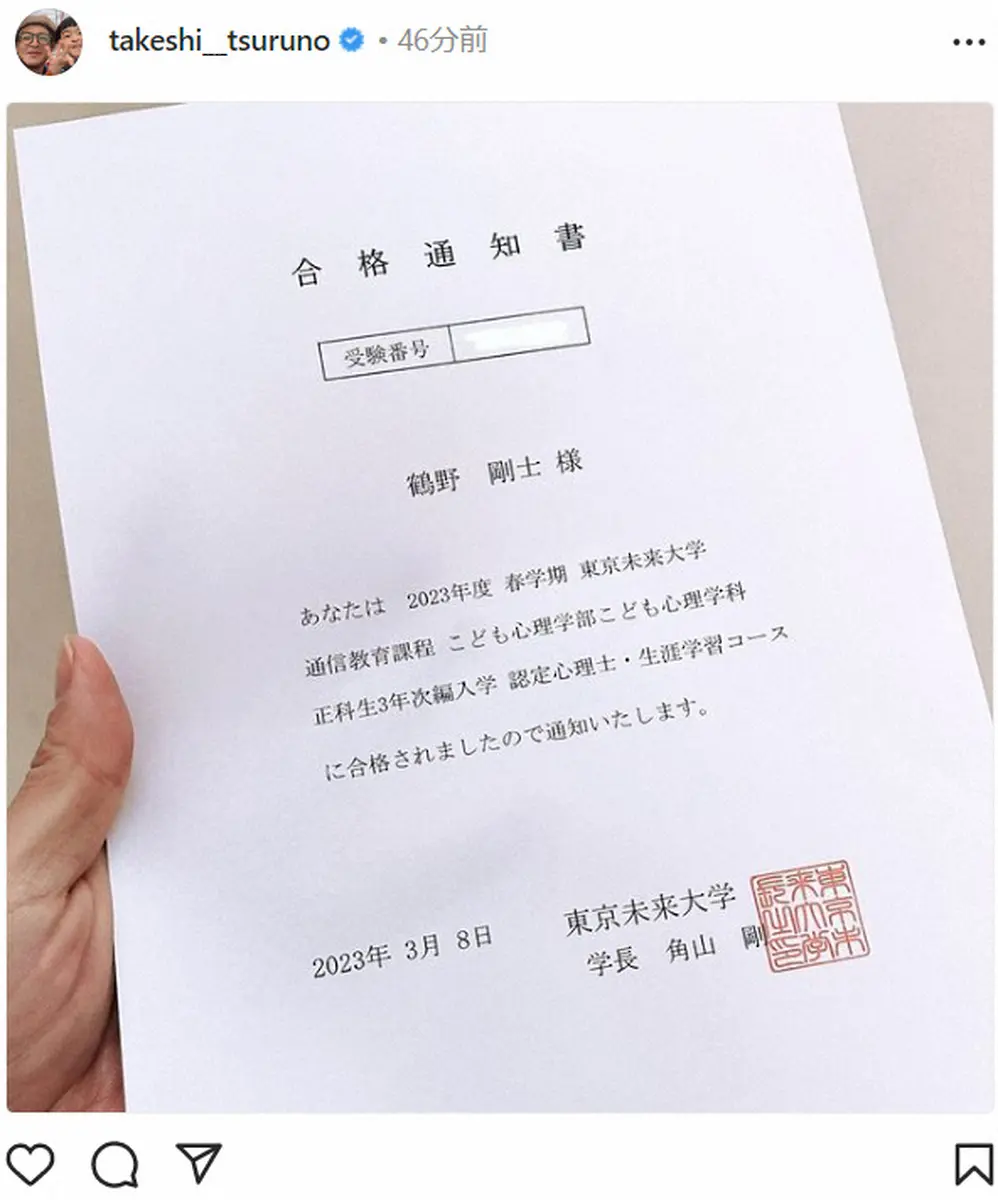 つるのは、東京未来大学の通信教育課程、こども心理学部子供心理学科の合格通知書をアップ。「4月からもうすこしだけ学ばせていただきます」とつづった。
