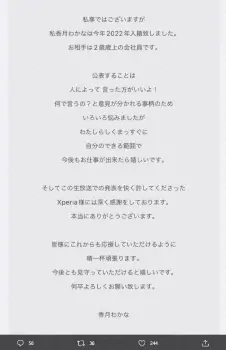2022年に、2歳年上の会社員との入籍を発表していた香月。この日、「突然のご報告ですみません。私事ですがこの度、3800gの元気な女の子を出産致しました」と報告した。「母子共に健康です」とし「幸せな気持ちとお腹の中にいる約10ヶ月間優しく見守ってくださった周りの方々への感謝が止まりません。夫婦で力を合わせ、お仕事とママの両立がんばります!!」と幸せいっぱいに思いを記した。