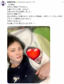 グラビアモデルで元ミスヤングチャンピオングランプリの香月わかな(29)が9日、自身のツイッターを更新。第1子女児を出産したことを発表した。