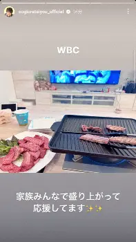 その後、試合が始まると辻が「頑張れJAPAN!!」とつづり、「焼肉食べながら…観戦」と報告。杉浦も巨大テレビの前で焼肉をしながら応援している様子を披露し「家族みんなで盛り上がって応援してます」と報告した。