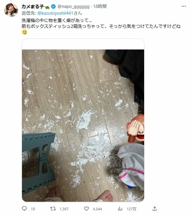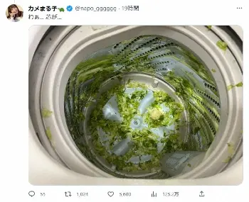 衝撃!レタスと一緒に回した洗濯物がぐちゃぐちゃに…(カメまる子のツイッターより@napo_gggggg) 人気YouTuberが衝撃報告!なぜか洗濯機の中にレタスを放置…「忘れてて丸ご… ギャラリーで見る この記事のフォト 2023年03月10日の画像一覧 もっと見る 2023年03月10日の画像をもっと見る