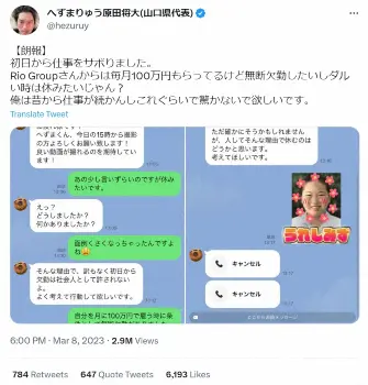 2月24日に「月収100万円で雇ってくれる企業さんを募集したら見つかりました。福岡中洲でキャバクラなど経営する大手ナイトレジャーRio Groupさんです。尚、広報担当として仕事をし時には無断欠勤や仕事をサボります」とつづっていたが、初日から欠勤したと明かしたうえで「Rio Groupさんからは毎月100万円もらってるけど無断欠勤したいしダルい時は休みたいじゃん?俺は昔から仕事が続かんしこれぐらいで驚かないで欲しいです」とつづり、企業側とのLINEのやりとりもアップした。