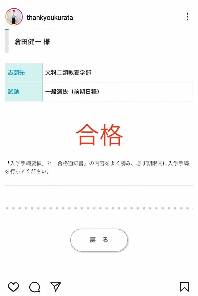 倉田はツイッターで「1月に共通テストを受け、2月25日26日に東京大学を受験しました。先程、合格発表があって、合格しました。今はただ、喜びを噛みしめています。重畳だ。がんばって、よかった」と喜びの報告。本名「倉田健一様」宛ての合格通知を公開し、「文科二類」に前期日程の一般選抜で合格したことを明かした。