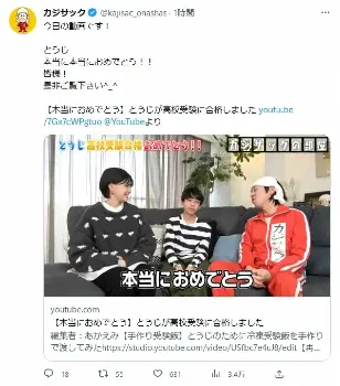梶原は「発表させてください。とうじ、高校受験合格しましたー!」と、長男が第一志望校に合格したことを祝福する。「おそらく視聴者の方も手を叩いて“おめでとう”と言って喜んでくれていると思います。なぜなら、1年間塾に通い続けてですね、実は2か所に通っていて。動画出演も控えながらね」と労をねぎらっていた。