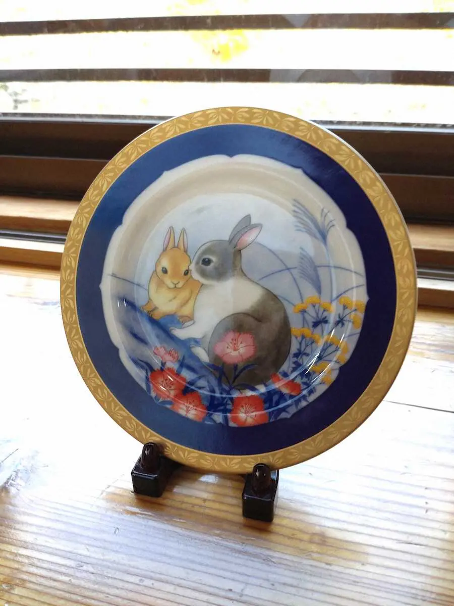 対局場の装飾には、有田焼の数十万円はする大きなつぼやひな人形などとともに2匹のウサギが並んでいる皿が1枚飾られていた。