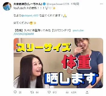 大家は「ダイエットとリバウンドに苦しんできまして」といい、自身の体重遍歴を振り返る企画を行うことに。AKB48に加入した15歳の頃は標準体型だったというが、グラビアの撮影などがありダイエットを決意。「一番やせてたときは、46キロでした。華奢になりすぎて、逆に顔が大きく見えていた」と回顧していた。