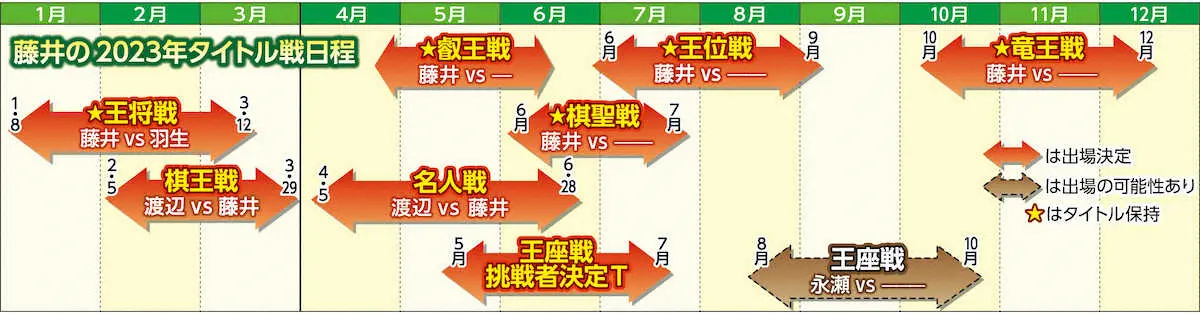 以上、王将を獲得しても棋王1勝、名人4勝、叡王3勝、棋聖3勝、王位4勝のタイトル戦15勝が必要。その上で、例年9月から5番勝負が始まる王座戦への挑戦権を確保しなければならない。