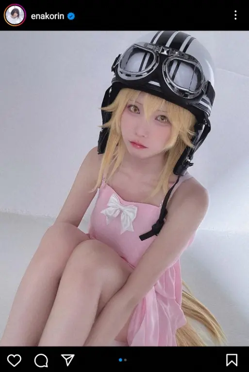「本日発売の『週刊少年マガジン』にて、『化物語』最終回記念のコスプレグラビアにお呼びいただきました」とつづり、同作に登場するドーナツが大好きな吸血鬼・忍野忍(おしの・しのぶ)のコスプレを披露。金髪で半帽ハーフのメガネ付きヘルメットをかぶり、ピンクのキャミワンピ姿の写真をアップした。