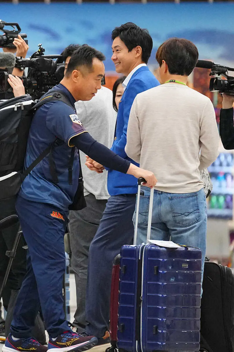 マイアミ国際空港で侍ジャパンの到着を待つ石井大裕アナウンサー(中央)=撮影・会津 智海