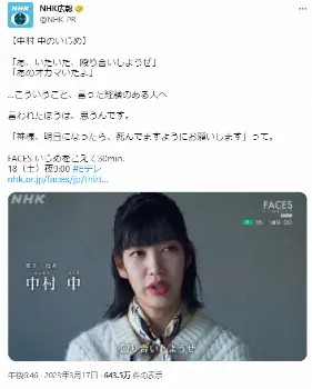 3月17日午後6時ごろに投稿した18日放送の「FACES いじめをこえて30min.」の告知内容について、「ご案内について誤解を招く表現がありました。今回のツイートは、番組のご案内としてNHKから発信したものです。関係の皆様に深くお詫び申し上げます」とした。