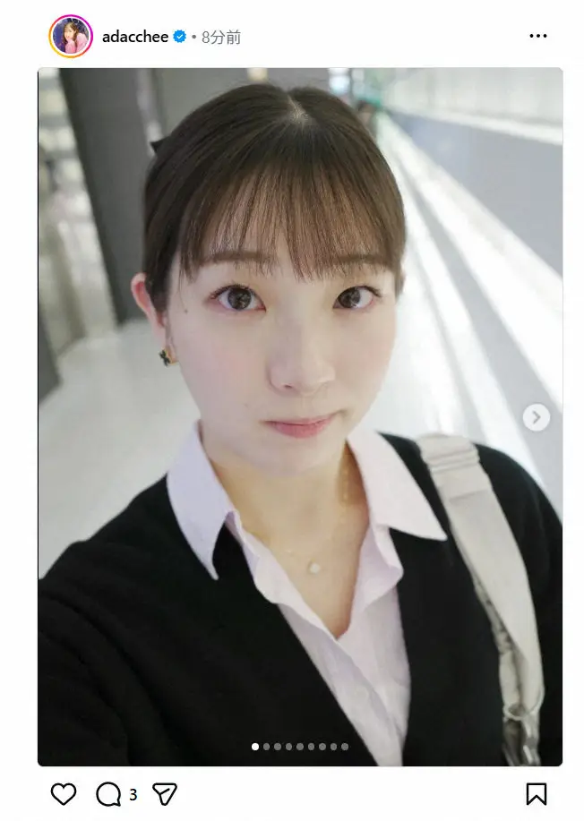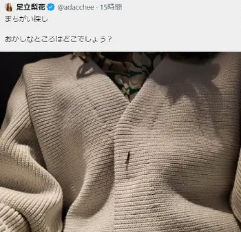 19日夜、足立は上半身アップの自撮りを投稿し「まちがい探し おかしなところはどこでしょう?」と投稿。「正解は…ボタンと見せかけて海苔がついていた…でした!!!」と、茶目っ気たっぷりにつづった。