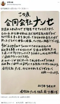 雅代さんは「合同会社ナンセ、みなみかわをどうぞよろしくお願いいたします」とつづるも「松竹芸能さん怒らないでください!」とツイートした。