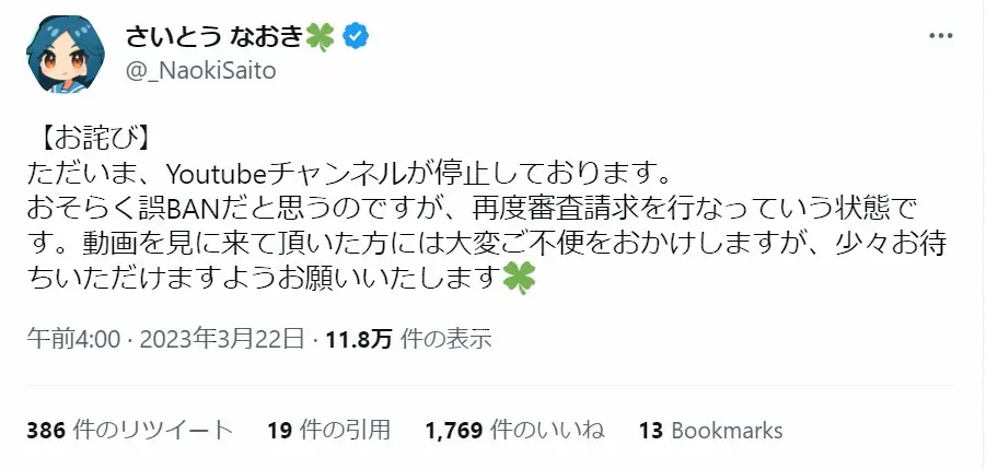22日午前8時半現在、さいとう氏のYouTubeチャンネルにアクセスすると、「Googleの利用規約に違反していたため、このアカウントを停止しました」と表示される。同日午前4時、さいとう氏はツイッターに「【お詫び】ただいま、Youtubeチャンネルが停止しております。おそらく誤BANだと思うのですが、再度審査請求を行なっていう状態です。動画を見に来て頂いた方には大変ご不便をおかけしますが、少々お待ちいただけますようお願いいたします」と投稿。さらに「アカウントをいきなり停止されるのは、ちょっと初めての経験なので、内心かなり動揺っております」「春は“BAN祭り”の季節だからしかたない」などと連投している。