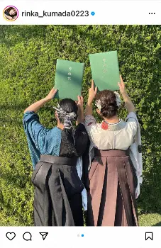 「2枚目は、入学当初から仲良くしてくれた友人と」と後ろ向きの友人との袴ショットを披露。「初日に人見知り発動して、1番後ろの席の端に座っていたら話しかけてくれて、、4年間ありがとう」と友人に感謝し、「学食にお気に入りの定食があったから、また機会があったら食べに行きたいな」と締めくくった。