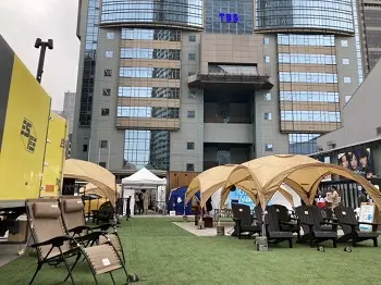 「赤坂サウナ祭り」ではTBS本社屋のおひざ元で、車体を改造した5つの移動式サウナや2種類の温度を用意した水風呂などを楽しめる。週末には有名アウフギーサーたちが駆けつけて熱波を届けてくれることもあり、いちサウナーとしてはワクワクしながら水着になって会場に足を踏み入れた。