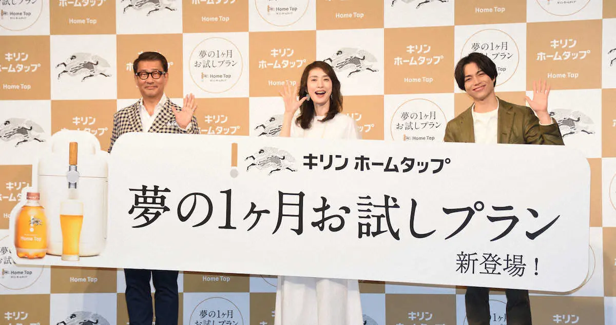 「会員制生ビールサービス『キリン ホームタップ』サービスアップデート発表会」に登場した(左から)中井貴一、天海祐希、「ジャニーズWEST」重岡大毅