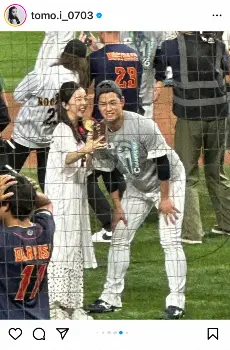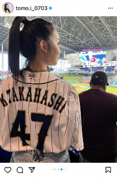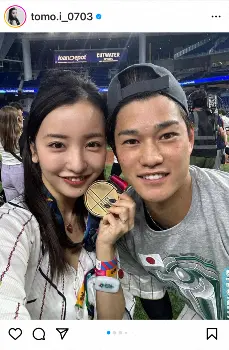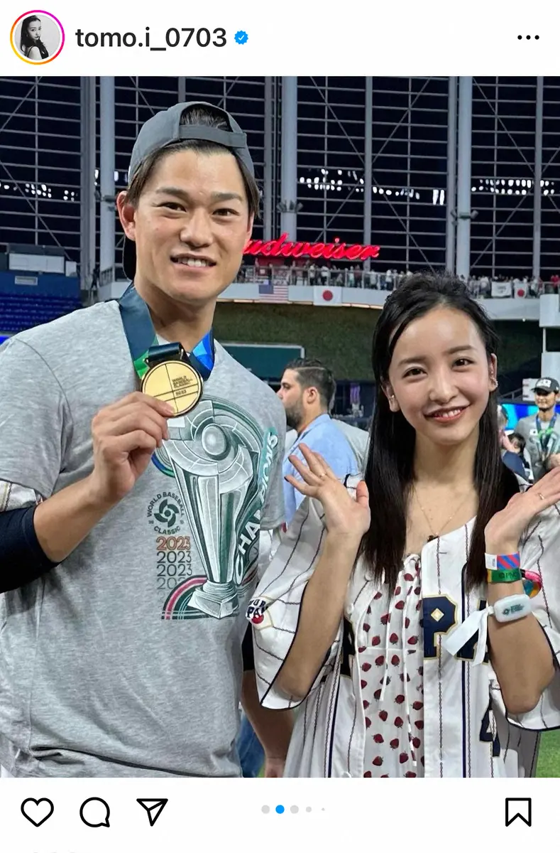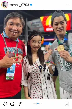 「WBC14年ぶりの優勝おめでとうございます そして、選手の皆さん、ファンの皆様、関係者の皆様、本当にお疲れ様です。感動の連続で、私も家族として僭越ながら近くで応援させてもらえた事に感謝です」とつづり、金メダルを首からかけた夫との顔寄せ自撮りショットなどをアップした。
