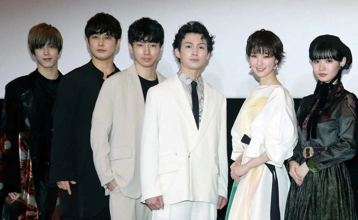 映画「仁義なき幕末 龍馬死闘篇」の初日舞台あいさつを行う(左から)本田礼生、石黒英雄、矢崎広、松田凌、剛力彩芽、荒川ちか