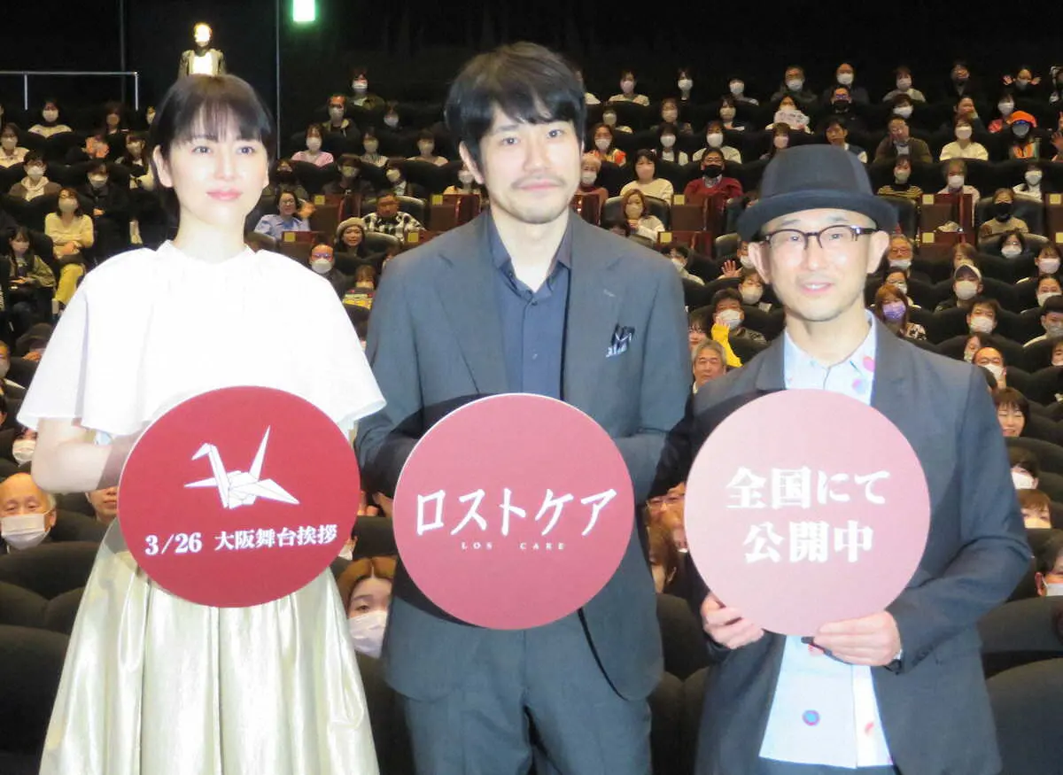 大阪市内で映画「ロストケア」の舞台あいさつを行った(左から)長澤まさみ、松山ケンイチ、前田哲監督