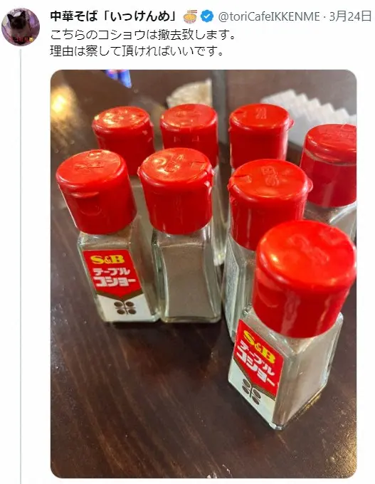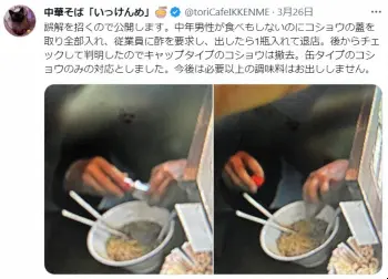 この投稿がさまざまな憶測を呼んだため、店側は26日に「誤解を招くので公開します。中年男性が食べもしないのにコショウの蓋を取り全部入れ、従業員に酢を要求し、出したら1瓶入れて退店」と、客による迷惑行為があったことを報告。「後からチェックして判明したのでキャップタイプのコショウは撤去。缶タイプのコショウのみの対応としました。今後は必要以上の調味料はお出ししません」と理解を求めた。