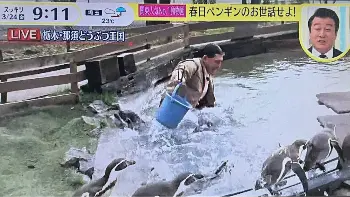 問題となっているのは、春日が「スッキリ」生中継で同動物園を訪れ、ペンギンの世話にチャレンジするシーン。エサやりを行ったが、池に体ごと落ちるというシーンが何度も放送された。スタジオで中継を見ていたMCの加藤浩次が何度も「足元気をつけろよ」と話し、春日が池に落ちると、スタジオで笑いも起きた。池の中にはペンギンが数匹泳いでいた。