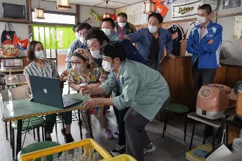 連続テレビ小説「舞いあがれ!」第125話。『うめづ』にて。パソコン画面を観る(左から)梅津歩、梅津貴司(赤楚衛二)、才津祥子(高畑淳子)、岩倉めぐみ(永作博美)(C)NHK