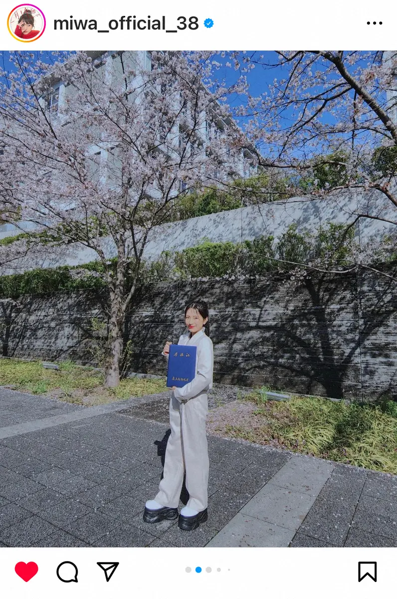 miwaは「慶應義塾大学大学院修士課程を修了しました!」と桜をバックにして修了証書を手にした写真とともに報告。「コロナ禍でオンラインでも、たくさんコミュニケーションをとって指導してくださった先生方と先輩に心から感謝しています。そして、授業や修論で励まし合った同級生のみんなは心の支えでした」とつづった。