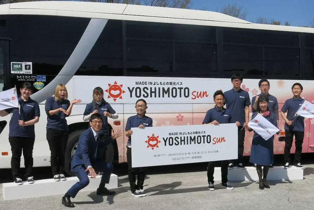 会見後、サイドに「YOSHIMOTO」と大きく書かれた専用の観光バスに関係者、報道陣を乗せて大阪市内を観光。ちかこ先生が美空ひばりのモノマネでガイド。「パネルクイズアタック25」で優勝歴のあるデレク(39)が大阪観光スポットなどのクイズを出題して盛り上げた。
