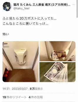 猫月は「ふと見たら20万ポストに入ってた…こんなところに置いてたっけ…怖い」と、画像をアップ。そこには輪ゴムで留められた現金20万円が映し出されていた。また、手紙も同封されており、震えた文字で「きょうも はいしん ありがとう」と記されていた。