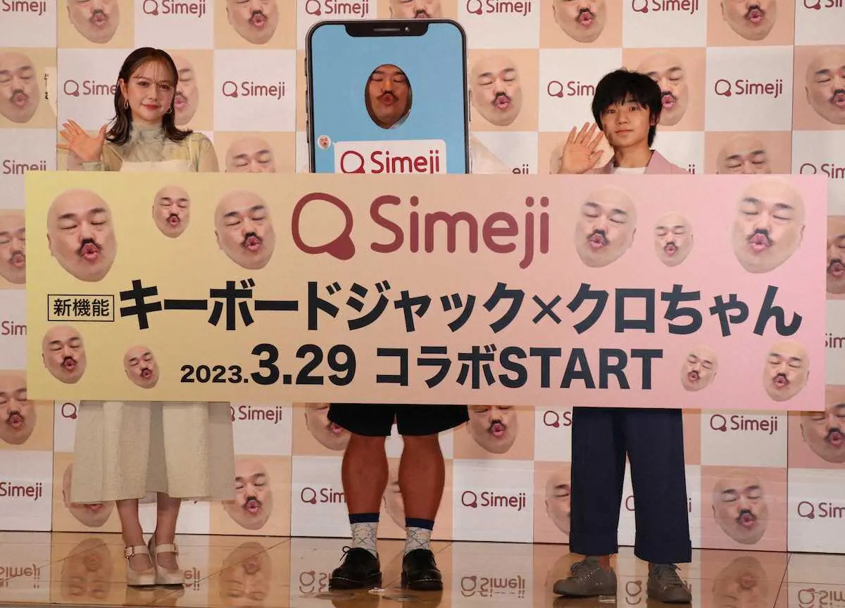 お笑いトリオ「安田大サーカス」のクロちゃん(46)、俳優の寺田心(14)、村重杏奈(24)が29日、都内で文字入力アプリ「Simeji」の新機能キーボードジャック&クロちゃんコラボ発表会に出席した。