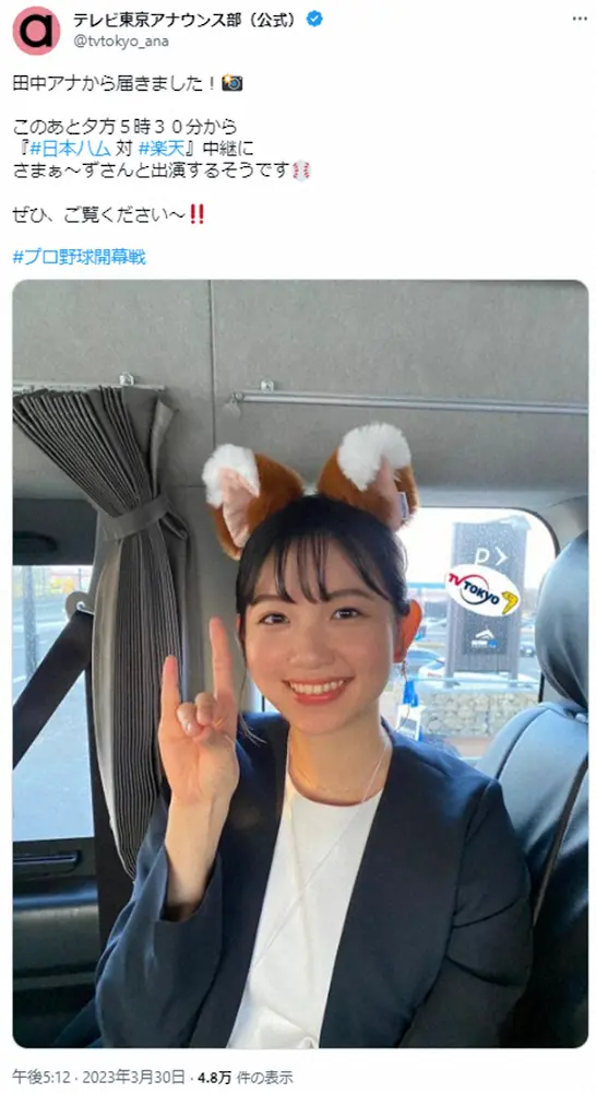 テレビ東京の田中瞳アナウンサー(26)が30日、プロ野球開幕戦「日本ハム―楽天」の試合中継に出演。日本ハムの球団公式チアリーダー「ファイターズガール」でお馴染みの“きつね耳姿”を披露するとネットが沸いた。
