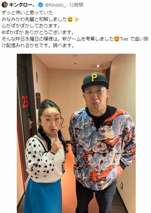 フジテレビ「ぽかぽか」(月~金曜前11・45)に出演した2人。キンタロー。は「ずっと怖いと思っていたみなみかわ先輩と和解しました 心がぽかぽかしております。#ぽかぽか ありがとうございます」と、みなみかわとの2ショットを公開した。