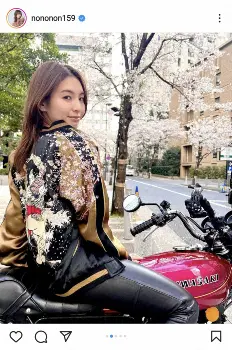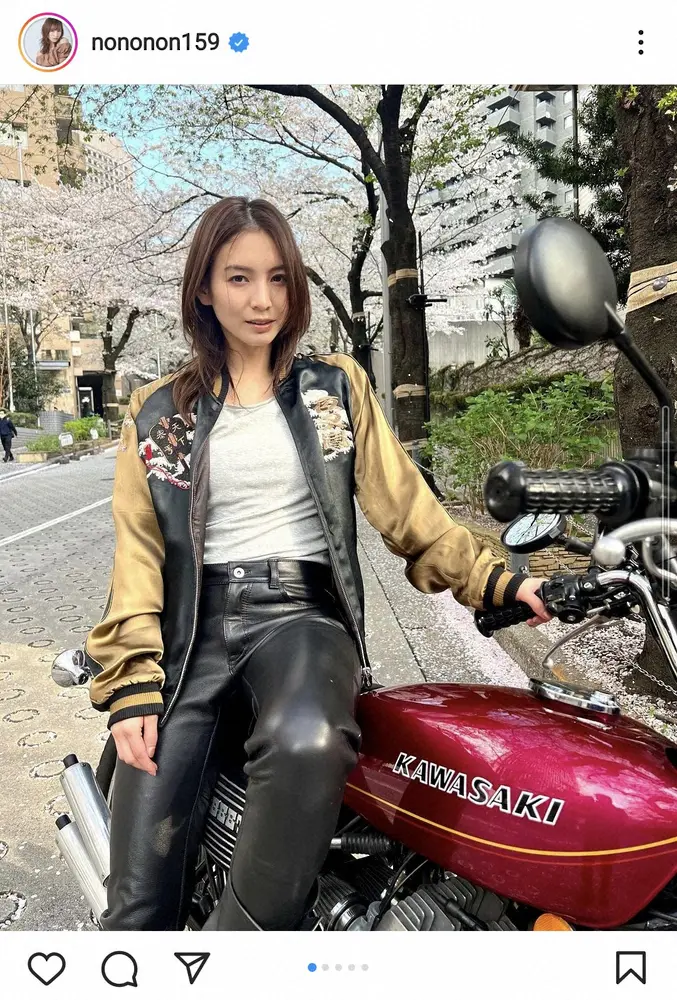 「桜が満開なスポットでお花見ドライブ」と記すと、黒と金色のスカジャンにグレーのインナー、黒の革パン姿で愛車である絶版車・KH400にまたがるショットをアップ。「桜吹雪のスカジャンとセット感でて良い感じ」とつづった。ハッシュタグでは「#KH400」「#kawasaki」「#KH250」「#KH」「#バイク女子」「#旧車」「#絶版車」「#カワサキ」などと添えた。
