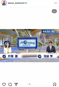 片渕アナは「4月から、モーニングサテライト月曜日のメインキャスターを務めさせていただくことになりました」と報告。「これから毎週月曜日は池谷キャスター、矢内キャスターと共にお伝えします」という。