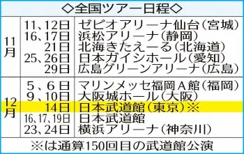 矢沢は3日午前4時、自身の公式サイトで今年のライブ日程を公表。11月11日から「Welcome to Rock’n’Roll」と題した全9カ所18公演の全国アリーナツアーを敢行し、その終盤に前人未到の武道館150回記念ライブが組まれている。