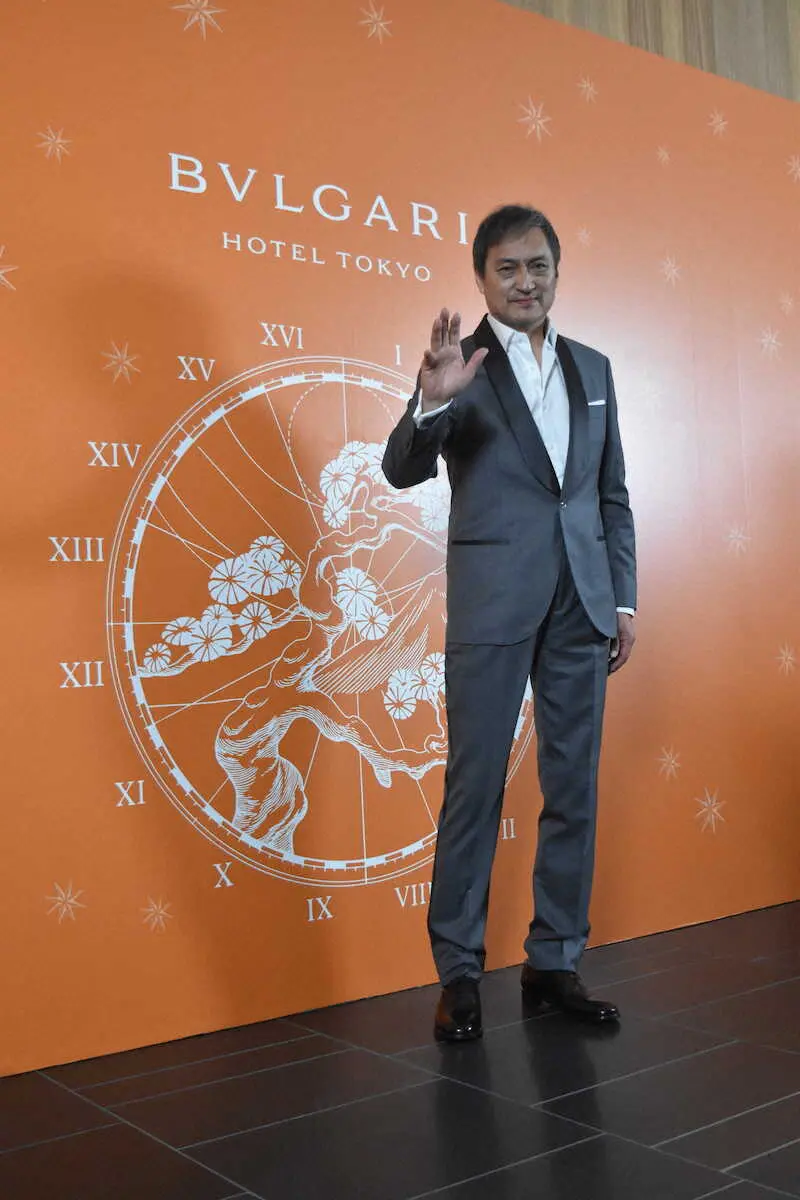 高級ブランド「ブルガリ」による高級ホテル。同ブランドの時計を身につけて登場した。「3年前に(日本)アカデミー(賞)の最優秀助演男優賞の賞品で頂いた。刻印してあるので大事に、大切な日に使うようにしている」と思い入れを明かした。