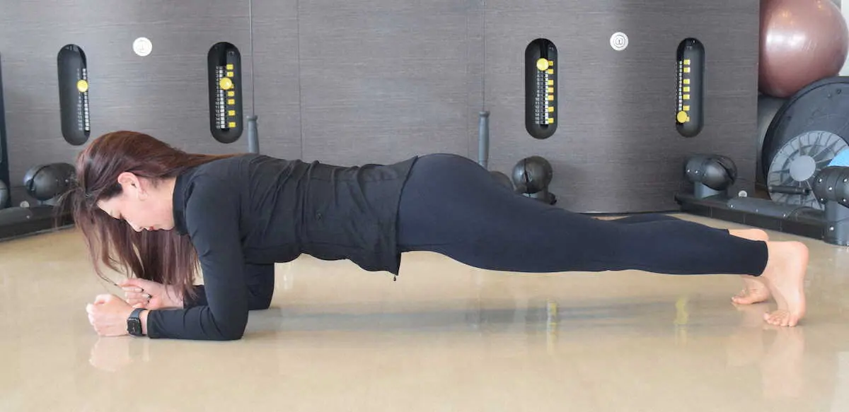 注意点は写真(3)のように、最初の姿勢で腰がそってしまわないこと。頭からかかとまで一直線になるようにキープしてください。お尻を上げる動作を加えることで体幹がより使われて、普通のプランクより全身運動の要素が強まります。まずは10回を目標にやってみましょう。
