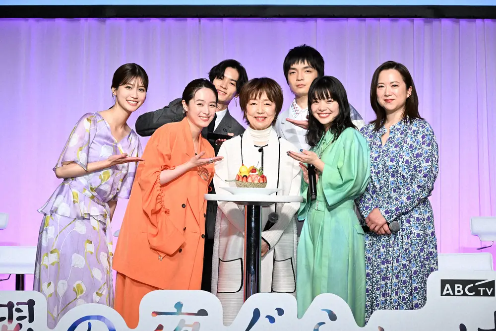 ABC「日曜の夜ぐらいは…」の出演者。中央の宮本信子さんから時計回りに清野菜名さん、生見愛瑠さん、川村壱馬さん、岡山天音さん、和久井映見さん、岸井ゆきのさん(写真提供 ABCテレビ)