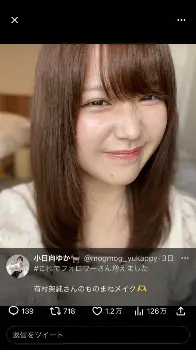 小日向は「#これでフォロワーさん増えました」とツイートし「有村架純さんのものまねメイク」と画像を投稿。まるで本人と見間違うようなクオリティに、1万2000件を超える「いいね」がつき、また125万回表示を記録していた。