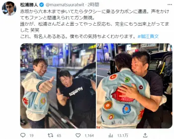 松浦氏は「赤坂から六本木まで歩いてたらタクシーに乗るタカポンに遭遇」とつづり、舌を出してポーズを決める、実業家の堀江貴文氏との写真をアップ。「声をかけてもファンと間違えられてガン無視。誰かが、松浦さんだよと言ってやっと反応も、完全にもう出来上がってました 笑笑」という。「これ、有名人あるある。僕もその気持ちよくわかります」と加えた。