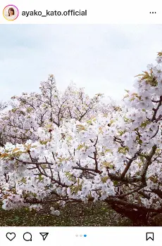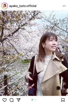 この投稿に、ファンからは「美女と桜 絵になるわ」「キレイ過ぎ!!」「加藤さんも桜も綺麗ですね」「桜と似合いますね」「綾子さんが似合ってて眩しい」「めっちゃかわいい」「元気そうで何よりです」「葉桜になりかけが一番素敵」「素敵な桜と笑顔ですね」「まだまだ満開ですね」「相変わらず綺麗だな」「カトパンさんの方が綺麗で美しいで」などのコメントを寄せられている。