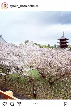 加藤は「京都仁和寺の桜」とつづり、ノーマスクでお花見を満喫するショットを披露。「ちょっと曇り空でしたがそれでもとっても美しかった」と記し、「#桜」「#京都」「#仁和寺」と添えた。